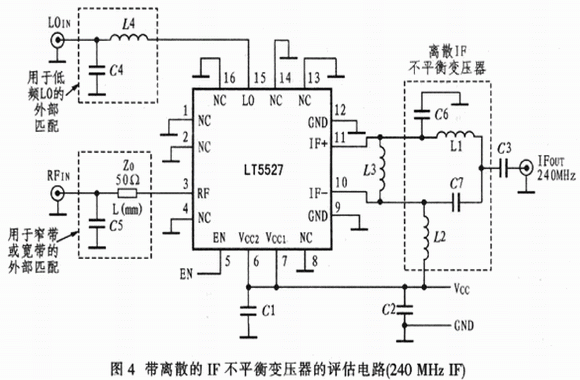 750 MHz以下的LO輸入匹配要求串聯(lián)電感L/4并聯(lián)電容C4,在650 MHz~830 MHz,其匹配網絡的L4=3.9 nH,C4=5.6 pF;在540 MHz~640MHz,其匹配網絡的L4=6.8 nH,C4=10 pF。評估板不包含L4的焊盤,因此可切斷近處的引腳15以便插入L4,L4是低功耗多層片式電感器。