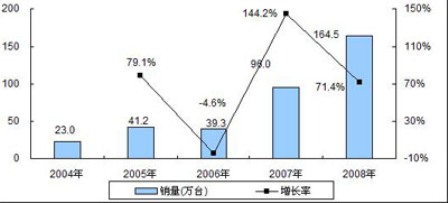 圖1 2004-2008年中國PND市場銷售量及增長率