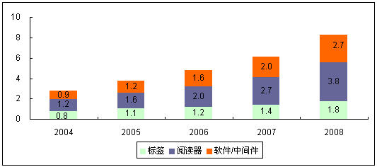 圖1 2004-2008年中國RFID市場規(guī)模與增長