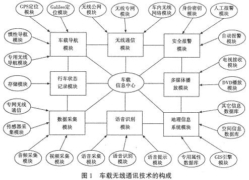 車載無線通訊技術(shù)由車載導(dǎo)航模塊、車載無線通信模塊、安全報警模塊、行車狀態(tài)記錄模塊、多媒體播放模塊、數(shù)據(jù)采集模塊、語音識別模塊、地理信息系統(tǒng)模塊八部分組成。所有的數(shù)據(jù)都通過車載信息中心進(jìn)行處理、協(xié)調(diào),并作出正確的反應(yīng)。圖l為車載無線通訊技術(shù)的構(gòu)成。