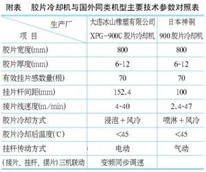 膠片冷卻機與密煉機、壓片機配套使用。將密煉機煉好的塑煉膠或混煉膠,經(jīng)壓片后,膠片進入該機進行浸泡,涂隔離劑后進入掛桿,經(jīng)冷卻干燥,最后進行連續(xù)疊片。這種膠片冷卻機是集日本、英國、臺灣等廠家的長處為一體,增加自主創(chuàng)新抓膠片的機械手部分,傳動裝置全部采用日本富士交流變頻器,實現(xiàn)抓膠片自動化、傳動調速同步化的自動控制系統(tǒng)。膠片冷卻機與國外同類機型主要技術參數(shù)對照表如附表所示。