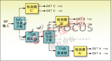 對(duì)于檢測(cè)器A的路徑,有40dB的衰減;如果輸入功率在+20dBm到-3.5dBm的范圍內(nèi),就要選擇該檢測(cè)器。因此,在二極管上的信號(hào)電平的變化范圍從-20dBm到-43.5dBm。檢測(cè)器B具有23dB的衰減,如果輸入功率的范圍在-3.5dBm到-23.5dBm之間,就要選擇該檢測(cè)器。在二極管上的信號(hào)電平的變化范圍從-26.5dBm到46.5dBm。
