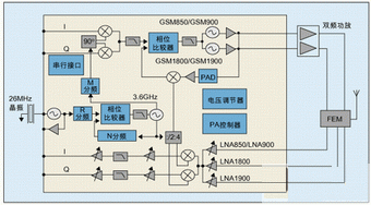 RF集成一個(gè)重要的發(fā)展出現(xiàn)在大約三年以前,當(dāng)時(shí)RF技術(shù)和數(shù)字基帶調(diào)制解調(diào)器的發(fā)展使得在無線手機(jī)中用直接下變頻接收器替代超外差射頻器件成為可能。超外差射頻器件使用多級(jí)混頻器、濾波器和多個(gè)電壓控制振蕩器(VCO),已經(jīng)很好地應(yīng)用了多年,但直接變頻射頻器件的集成度能夠大大減少GSM RF總體元件數(shù)。在上世紀(jì)九十年代后期,一個(gè)典型的單頻段超外差RF子系統(tǒng)包括PA、天線開關(guān)、LDO、小信號(hào)RF和VCTCXO,需要大約200個(gè)分立器件;今天,我們能夠設(shè)計(jì)一個(gè)具有四頻段功能的直接變頻系統(tǒng),集成了VCO、VCXO和PLL回路濾波器,而它的元件數(shù)卻少于50個(gè)。