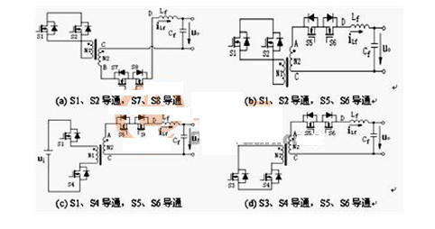 讓周波變換器的功率開關(guān)S5與S7(S6與S8)之間存在換流重疊導(dǎo)通時(shí)間、S5與S6(S7與S8)按濾波電感電流iLf極性選擇導(dǎo)通,從而使得該控制方案具有如下優(yōu)點(diǎn):1、周波變換器換流重疊期間實(shí)現(xiàn)了變壓器漏感能量的自然換流,實(shí)現(xiàn)了功率器件的零電流開關(guān);2、實(shí)現(xiàn)了濾波電感電流的自然續(xù)流;3、iLf極性選擇信號(hào)的引入避免了換流重疊期間周波變換器中的環(huán)流現(xiàn)象;4、每個(gè)開關(guān)周期內(nèi)兩次交流側(cè)的能量回饋實(shí)現(xiàn)了逆變橋所有功率器件的零電壓開通[5]。