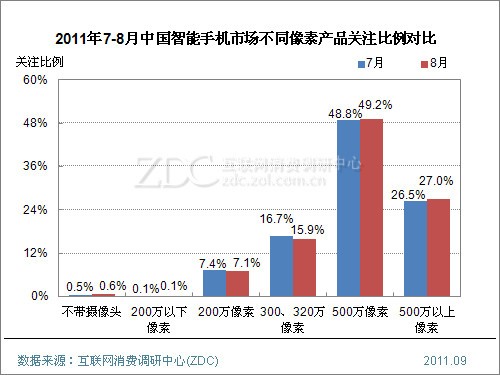 (圖)2011年7-8月中國智能手機市場不同像素產(chǎn)品關注比例對比
