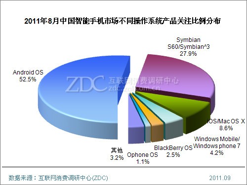 ZDC數(shù)據(jù)顯示,2011年8月中國智能手機市場上,搭載Android操作系統(tǒng)的智能手機用戶關注度已經(jīng)達到52.5%,較上月再度攀升2個百分點。而諾基亞Symbian系統(tǒng)智能手機的關注度則持續(xù)下滑,本月跌破三成。其他操作系統(tǒng)產(chǎn)品關注比例變動幅度不大。