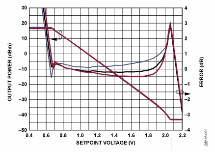 圖2:ADL5330輸出功率與AD8318設(shè)定點(diǎn)電壓關(guān)系曲線(xiàn),PIN = -1.5 dBm