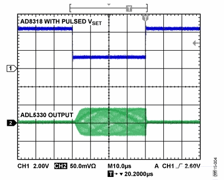 圖4顯示AGC RF輸出對(duì)VSET脈沖的響應(yīng)。當(dāng)VSET降至1 V時(shí),AGC環(huán)路以RF突發(fā)脈沖予以響應(yīng)。響應(yīng)時(shí)間和信號(hào)積分量由AD8318 CFLT引腳上的電容控制,這與積分放大器周?chē)姆答侂娙蓊?lèi)似。電容增加將導(dǎo)致響應(yīng)速度變慢。
