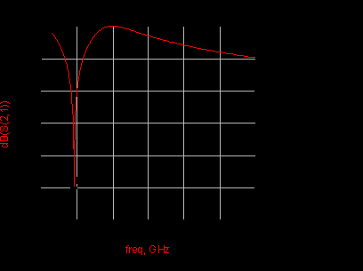 由于高頻段(DCS)的增益在第二和第三級時略低,因此設計第一級放大電路時,DCS頻段第一級增益比GSM頻段第一級高約3dB。同時,在DCS 頻段射頻輸入端加入濾波網(wǎng)絡,如圖2所示。此濾波網(wǎng)絡對GSM頻段信號起到帶阻作用,同時對DCS頻段信號起到帶通作用,加入此濾波網(wǎng)絡可有效地提高交叉隔離度。該濾波網(wǎng)絡的仿真原理圖與仿真結(jié)果分別如圖4、圖5所示。本設計電路GSM頻段和DCS頻段總增益仿真結(jié)果如圖6、圖7所示。