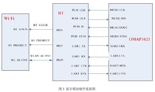AFH技術(shù)在上面已經(jīng)介紹過了,單獨使用AFH技術(shù)使用藍(lán)牙耳機(jī)的通話效果不是很好,為了解決這種問題,在使用AFH技術(shù)的基礎(chǔ)上又使用了三線共存(時分復(fù)用)技術(shù)。三線共存,顧名思義,就是使用三根線連接Wi-Fi和藍(lán)牙,下面結(jié)合圖3中Wi-Fi和藍(lán)牙所示的三線連接圖來描述一下三線共存的機(jī)制,其中主處理器使用的是TI公司的OMAP1621芯片。