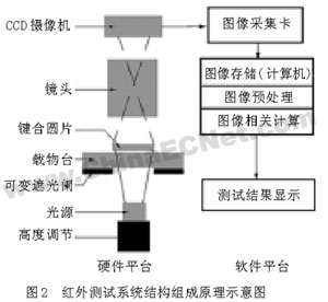 光源通過可變光闌照射到鍵合片,光線透過鍵合片,通過鏡頭,在攝像機(jī)上成像,從而獲得鍵合片的紅外圖像,通過數(shù)據(jù)采集卡送入計算機(jī),經(jīng)過圖像處理程序的處理,顯示測試結(jié)果。