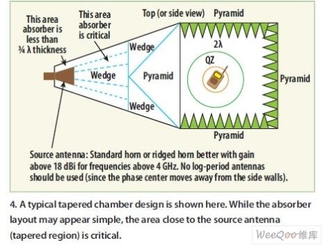 圖4:在典型的錐形暗室中,吸波材料的布局看起來很簡單,但離源天線較近的區(qū)域(錐形暗區(qū)域)非常重要。