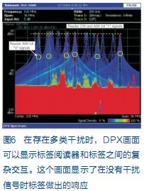 在進行頻率規(guī)劃,把每個閱讀器限定在某條通道(或多條通道)時,可以使用DPX保證調制邊帶的電平不會在并放閱讀器使用的通道中產生干擾。注意圖6中心的閱讀器和標簽信號擁有寬頻譜展寬,駐留時間要長于其它通道。較亮的信號邊緣表明信號密度較高,因此駐留時間較長。這可能會導致鄰道讀取失敗,應采取措施,保證閱讀器中的濾波功能足以抗擊這種干擾。