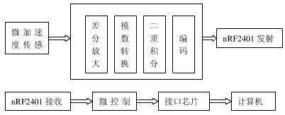 鼠標在人的操縱下移動,微加速度傳感器便會實時地輸出鼠標運動的加速度大小和方向,ADXL203傳感器的量程為±1.7gn ,電壓靈敏度為1000mV/gn,這個電壓信號經過差分放大5.0/1.7倍后,通過微控制器A/D轉換功能變成與加速度大小對應的數字信號,加速度經過兩次積分,便變成了鼠標移動的位移信號,然后,再經過編碼,并通過nRF2401射頻收發(fā)器將位移信號發(fā)射出去。