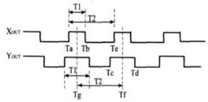 為了實現(xiàn)高精度測量,考慮到T2易受溫度漂移的影響,必須周期性地更新T2的平均值。一種新的改進型脈寬調制(PWM)解碼方法是通過占空比調制在X軸和Y軸使用相同的三角形參考波 ,使得每個周期中 T1的中點達到同步 ,這種方法能加快數據傳輸時間,也稱之為高速解碼,X軸和Y軸的占空比輸出如圖2所示。