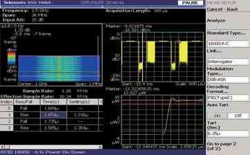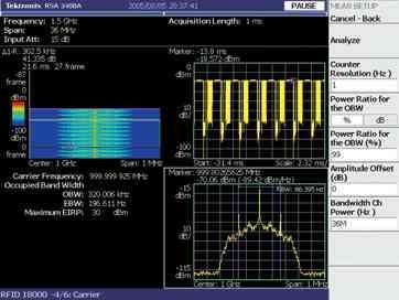 政府規(guī)定要求控制發(fā)射信號(hào)的功率、頻率、帶寬。這些規(guī)定防止有害干擾并保證每個(gè)發(fā)射者都是頻帶內(nèi)其他用戶的友好鄰居。對(duì)于許多頻譜分析儀特別是通常用于脈沖信號(hào)能量測(cè)量的掃頻頻譜分析儀,進(jìn)行此類測(cè)量是具有挑戰(zhàn)性的。RTSA 能夠分析一個(gè)完整的分組發(fā)射過(guò)程的能量特點(diǎn),也能直接測(cè)量跳頻信號(hào)的載波頻率,而無(wú)需將信號(hào)置于一個(gè)跨度的中心。按一下按鍵,分析儀就能識(shí)別一個(gè)瞬時(shí) RFID 信號(hào)的調(diào)制方式并能夠?qū)β?、頻率和帶寬進(jìn)行監(jiān)管測(cè)量,使預(yù)一致性(pre-compliance)測(cè)試過(guò)程變得非常靈活和方便 [參閱圖2]。預(yù)一致性測(cè)試有助于確保產(chǎn)品一次通過(guò)一致性測(cè)試,而無(wú)需重新設(shè)計(jì)和重新測(cè)試。