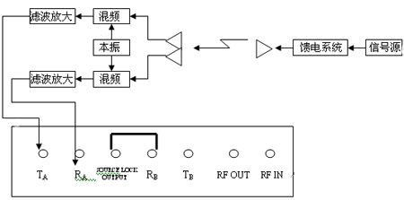 信號源輸出頻率為f1的信號,經(jīng)天線陣列饋電系統(tǒng)后由天線輻射出去,兩個接收天線的接收信號經(jīng)混頻變?yōu)轭l率為f2的信號,再經(jīng)濾波放大后分別饋入3630A的TA、、RA端。