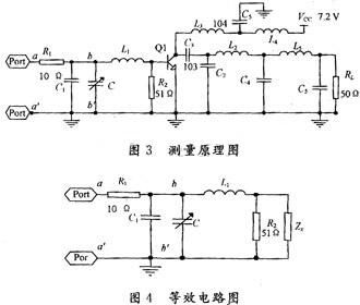 下面僅說明測量射頻功率管2SC1971的輸入阻抗的具體過程,輸出阻抗的測量方法與此相似。圖3是測量2SC1971的輸入阻抗的原理圖,圖4是他的等效電路圖。R1的值設(shè)計(jì)為10 Ω左右,以減少輸入的功率,同時(shí)HA由R1組成比較簡單,便于計(jì)算,HB由L1,C1,R2組成,同時(shí)也是功率管的匹配和偏置網(wǎng)絡(luò)。HA,HB也可以由多級L型或Ⅱ型雙口網(wǎng)絡(luò)組成,只是計(jì)算量增大。經(jīng)過實(shí)測采用單級L型網(wǎng)絡(luò)在bb′處測得的波形比較接近正弦波,測量出的結(jié)果誤差不大。