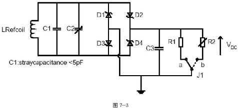 (2)被動模式接收:此為測試發(fā)起設(shè)備可以正確的接收被動目標(biāo)物所回傳的信號。利用圖7-2的loadmodulation測試線路所做成的referencedevice,先將對應(yīng)C3電壓與距離的關(guān)系以圖8的架構(gòu)校正好,之后即可將此卡與發(fā)起設(shè)備的待測物做量測,測試由referencedevice所發(fā)出的調(diào)變信號于待測物端的接收情況。在此只能對部分的測試項目做討論而詳細(xì)的測試請參考ECMA。