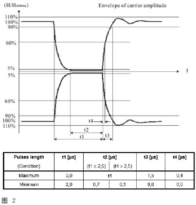 由于NFC106kbps為100%ASK調(diào)變,所以對整個High/Low信號的封包結(jié)構(gòu)都有相當(dāng)詳細(xì)的定義。其中幾個參數(shù)包括從100%下降到5%Am時間(t1)、5%Am持續(xù)時間(t2)、Am由5%上升至60%時間(t4)即overshoot的范圍。而212/424kbps則是8%~30%的調(diào)變率。