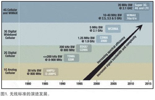 為了解決這一問題,無線提供商轉(zhuǎn)而采用了可提高頻譜效率的無線標(biāo)準(zhǔn)。這類似于將多輛駛往同一目的地的轎車碼放在一輛卡車上,并將卡車沿著高速公路開往目的地。這種方法使相同的高速公路上可以實(shí)現(xiàn)更多的數(shù)據(jù)傳輸流量,而不會(huì)導(dǎo)致流量降低。為了提高頻譜效率,我們可部署或定義所有的無線標(biāo)準(zhǔn),其中包括CDMA2000、W-CDMA、TD-SCDMA、MC-GSM、WiMAX以及LTE等。圖1顯示了近年來用于提高頻譜效率所部署或定義的無線標(biāo)準(zhǔn)。