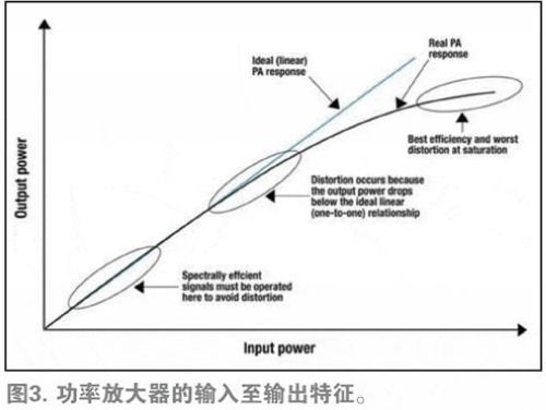 過去的無線標(biāo)準(zhǔn)使服務(wù)提供商在接近最大輸出功率下才運(yùn)行基站,從而實(shí)現(xiàn)最低的資本成本(覆蓋同一區(qū)域所需的基站更少),而且運(yùn)行成本也最低(電力成本更低)。但隨著無線用戶數(shù)量的爆炸式增長以及通過基礎(chǔ)局端傳輸?shù)臄?shù)據(jù)量大幅增長,這一狀況發(fā)生了改變,原因是還有PA第三個(gè)特性的存在:失真隨著輸出功率的增加而相應(yīng)增加,而當(dāng)PA開始與理想(線性)曲線背離時(shí),失真變得異常突出。