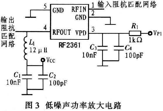 以低噪聲功率放大器RF2361為核心設(shè)計的低噪聲功率放大電路,如圖3所示,其VPD引腳上的并聯(lián)電容器實現(xiàn)電源VPD的濾波,RFOUT引腳上的電感電容串并聯(lián)網(wǎng)絡(luò)可對電源VCC濾波?! ?/p>