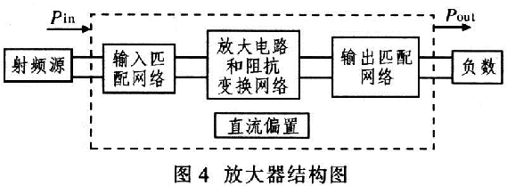 典型的放大器一般包括輸入匹配網(wǎng)絡(luò)、晶體管放大電路、阻抗變換網(wǎng)絡(luò)、直流偏置和輸出阻抗匹配網(wǎng)絡(luò),如圖4所示。確定阻抗匹配網(wǎng)絡(luò)中元件的參數(shù)、類型以及連接關(guān)系是實現(xiàn)匹配網(wǎng)絡(luò)的關(guān)鍵。阻抗匹配是射頻電路設(shè)計的重要問題,其目的是為了實現(xiàn)能量的最大功率傳輸,提高能量的傳輸效率。