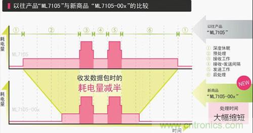 LAPIS Semiconductor去年推出的“ML7105”,實(shí)現(xiàn)了業(yè)界頂級(jí)的低耗電量(收發(fā)數(shù)據(jù)包時(shí)的運(yùn)行狀態(tài))。此次開(kāi)發(fā)出的新品“ML7105-00x”,不僅保持了運(yùn)行狀態(tài)下的低耗電量性能,而且平均電流還減少了一半。所謂平均電流,是指按一定間隔反復(fù)收發(fā)數(shù)據(jù)包時(shí)的運(yùn)行狀態(tài)(耗電量大)與休眠狀態(tài)(耗電量?。┑钠骄娏髦?。通過(guò)大幅減少改變狀態(tài)所需的時(shí)間,使平均電流減半,從而使電池壽命可達(dá)2倍。因此,按LAPIS Semiconductor的工況條件,支持Bluetooth® Low Energy的、使用紐扣電池(CR2032)的設(shè)備其電池壽命即使在24小時(shí)連續(xù)工作的條件下,也可充分使用2年。
