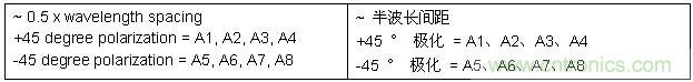 此例為一個(gè) 8 陣元物理天線,采用兩組天線單元配置。兩組天線單元彼此以 90? 正交交叉極化。天線組 0 包括天線單元 1 至 4,以 +45? 進(jìn)行極化。天線組 1 包括天線單元 5 至 8,以 -45進(jìn)行極化。