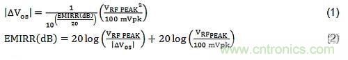 方程式(1)和(2)給出了EMIRR的數(shù)學(xué)定義。兩個方程式互為彼此的重置版本。方程式(1)展示了所用RF信號和偏移電壓的改變之間的關(guān)系。請注意所用RF信號的平方引起的偏移電壓變化。這意味著入射RF信號較小幅度的增加可導(dǎo)致偏移電壓的顯著增加。還請注意,術(shù)語EMIRR的作用是減弱RF信號的影響;換句話說,較大的EMIRR(dB)可使偏移電壓的變化大幅度減少。方程式(2)是在表征過程中用來計算EMIRR(dB)的方程形式。