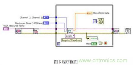 左邊的三個(gè)控制用于輸入設(shè)置,包括連接的VISA 資源名稱(chēng),獲取數(shù)據(jù)的通道,最大延遲時(shí)如何實(shí)現(xiàn)對(duì)示波器的遠(yuǎn)程控制間。右邊為結(jié)果波形顯示控件。設(shè)計(jì)好前面板以后,就可以進(jìn)入程序框圖設(shè)計(jì)了。在VI 的程序框圖中的Function 面板中,選擇“儀器I/O”可以找到有關(guān)ZDS2024 的驅(qū)動(dòng)庫(kù)的模塊,可以在程序框圖中直接使用,設(shè)計(jì)結(jié)果如圖5所示。