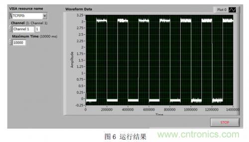 在程序框圖中,先初始化示波器,并啟動(dòng)示波器的AutoSetup 功能,然后循環(huán)獲取示波器的數(shù)據(jù),并送顯示,直到用戶(hù)中止或者獲取數(shù)據(jù)過(guò)程中出現(xiàn)錯(cuò)誤。最后可以在前面板啟動(dòng)運(yùn)行,結(jié)果如圖6所示。
