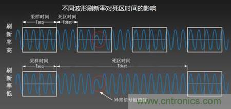 死區(qū)時間指的是示波器對采樣存儲回來的數(shù)字信號進行測量運算,顯示等處理的過程。其中死區(qū)時間內示波器不進行采集。