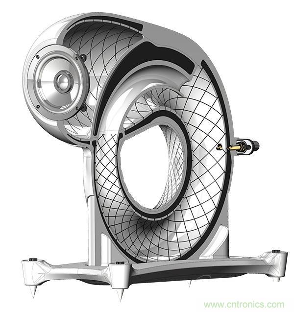 為了不必使用聲波吸收就能夠解決這個(gè)問(wèn)題,畢業(yè)于以色列Bezalel藝術(shù)與設(shè)計(jì)學(xué)院的工業(yè)設(shè)計(jì)師Boaz Dekel提出了一個(gè)非常獨(dú)特的解決方案:去掉音箱的后壁。簡(jiǎn)單地說(shuō),Dekel構(gòu)思了一個(gè)圓形音箱Aleph1。在這個(gè)音箱里,向后的聲音會(huì)進(jìn)入“一個(gè)永久的自送(self-feeding)回路,以防止它被直接反彈回去,干擾到向前輸出的聲音信號(hào)。”Dekel解釋說(shuō)。