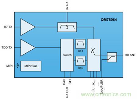 圖 1 所示為 RF Fusion QM78064 高頻段模塊,它同時支持 FDD-LTE(帶有集成頻段 7 雙工器)和 TDD-LTE(頻段 40 和 41),并搭載一個支持 20 MHz + 20 MHz 上行載波聚合的寬帶 B41 LowDrift™ BAW 濾波器。該模塊還配備一個天線開關(guān)并支持包絡(luò)跟蹤 (ET) 和平均功率跟蹤 (APT),以盡可能減少能源消耗。