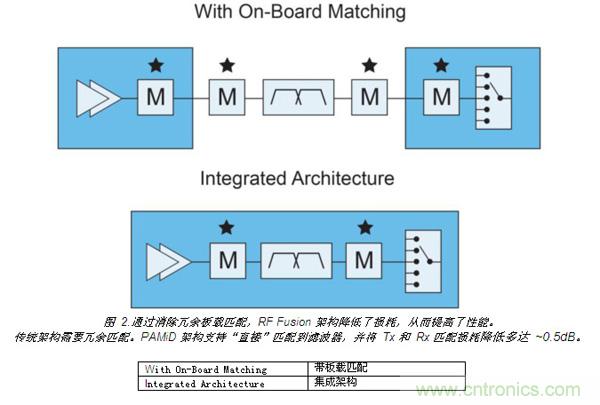 如圖 2 所示,每條通道上實現(xiàn)元件集成,無需對元件進行板載匹配,從而提升了性能。這將發(fā)射和接收的匹配損耗降低多達 0.5 dB,進而降低電流消耗和熱負荷。這種布局還在功率放大器的帶寬范圍內(nèi)集成相應頻段的濾波器,確保了每個功率放大器能得到最高效的利用。每個模塊的改進性能使制造商更容易實現(xiàn)手機的整體性能目標。
