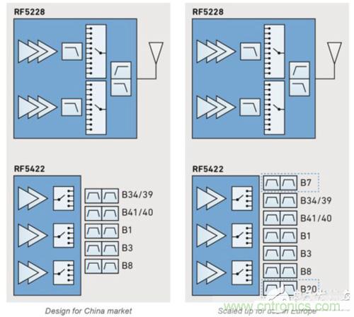 場景 1 制造商設(shè)計了一款采用 RF5422 多頻段 PA 模塊和 RF5228 高級發(fā)送模塊的中端手機。RF5422 提供所有必要的 3G 和 4G PA 功能;RF5228 為所有頻段提供 2G 支持和天線開關(guān)功能。針對中國市場,制造商添加了濾波器以支持 1、3、8、34、39、40 和 41 頻段。通過簡單添加頻段 7 和 20 的濾波器,即可針對歐洲的使用來對相同設(shè)計進行擴展。制造商可以在兩個區(qū)域使用相同的 PCB 設(shè)計,并根據(jù)需要在 PCB 中添加濾波器。
