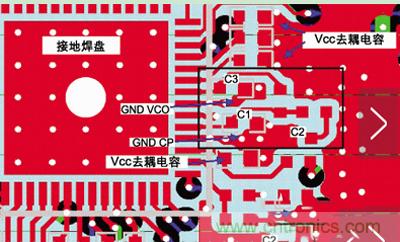 在本文的后面部分將會(huì)看到,PLL的實(shí)現(xiàn)在系統(tǒng)設(shè)計(jì)中總是面臨巨大挑戰(zhàn),要想獲得滿意的雜散特性必須有良好的地線布局。目前,IC設(shè)計(jì)中將所有的PLL和VCO都集成到了芯片內(nèi)部,大多數(shù)PLL都利用數(shù)字電流電荷泵輸出通過一個(gè)環(huán)路濾波器控制VCO。通常,需要用二階或三階的RC環(huán)路濾波器濾除電荷泵的數(shù)字脈沖電流,得到模擬控制電壓??拷姾杀幂敵龅膬蓚€(gè)電容必須直接與電荷泵電路的地連接。這樣,可以隔離地回路的脈沖電流通路,盡量減小LO中相應(yīng)的雜散頻率。第三個(gè)電容(對(duì)于三階濾波器)應(yīng)該直接與VCO的地層連接,以避免控制電壓隨數(shù)字電流浮動(dòng)。如果違背這些原則,將會(huì)導(dǎo)致相當(dāng)大的雜散成分。