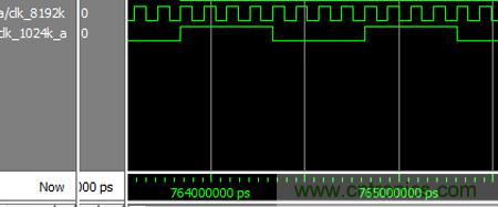 利用FPGA對8192kHz的基準時鐘進行時鐘分頻,分別得到1024kHz、512kHz、256kHz和1kHz的時鐘頻率,需要分別進行8分頻、16分頻、32分頻和8192分頻。在利用FPGA進行設計整數(shù)分頻器時,通過VHDL硬件描述語言利用計數(shù)器方式來實現(xiàn)。