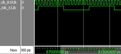 根據(jù)所需的時鐘頻率為512kHz的時鐘,而晶振時鐘的頻率為8192kHz,晶振時鐘與所需的時鐘頻率恰巧是16倍的整數(shù)倍關系,因此需要對8192kHz的晶振時鐘進行16分頻來獲得所需要的時鐘。根據(jù)整數(shù)倍分頻器的設計方法原理,通過ISE9.1邏輯設計工具,利用VHDL硬件描述語言來進行16分頻的分頻器設計。然而16又是偶數(shù),所以需要設計的是偶數(shù)分頻器。對設計的內容通過Modelsim6.5仿真軟件進行仿真驗證,結果如圖3-2所示。