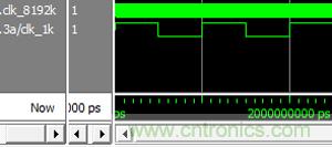 根據(jù)所需的時鐘頻率為1kHz的時鐘,而晶振時鐘的頻率為8192kHz,晶振時鐘與所需的時鐘頻率恰巧是8192倍的整數(shù)倍關系,因此需要對8192kHz的晶振時鐘進行8192分頻來獲得所需要的時鐘。根據(jù)整數(shù)倍分頻器的設計方法原理,通過ISE9.1邏輯設計工具,利用VHDL硬件描述語言來進行8192分頻的分頻器設計。然而8192又是偶數(shù),所以需要設計的是偶數(shù)分頻器。對設計的內容通過Modelsim6.5仿真軟件進行仿真驗證,結果如圖3-4所示。