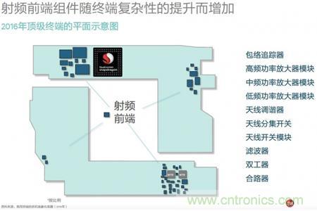 射頻前端之所以越來越復雜,一個主要驅(qū)動因素是終端產(chǎn)品,由于終端產(chǎn)品多模、多頻段的趨勢導致。觀察下圖,一款4G全網(wǎng)通手機的PCB板上,囊括數(shù)十顆射頻芯片,頂級終端所占比例更大。
