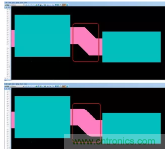 設(shè)計用于射頻和微波的銅箔形狀時,一個很重要的方面是能夠建立帶尖拐角的 Gerber檔。優(yōu)秀的PCB設(shè)計工具可以簡化這一過程。例如,使用50毫米線條繪制形狀與使用50毫米圓形光圈繪圖相比,往往令設(shè)計具有較小的半徑。設(shè)計工具在建立Gerber檔時,可透過正確地自動轉(zhuǎn)換線條寬度來獲得尖拐角(圖 2)。