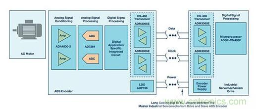 【導(dǎo)讀】旋轉(zhuǎn)編碼器廣泛用于工業(yè)自動化系統(tǒng)中。此類編碼器的典型應(yīng)用是電力機(jī)械,其中編碼器連接到旋轉(zhuǎn)軸,從而向控制系統(tǒng)提供反饋。雖然編碼器的主要用途是角度位置和速度測量,但系統(tǒng)診斷和參數(shù)配置等其他特性也很常見。圖1顯示了一個電機(jī)控制信號鏈,其利用RS-485收發(fā)器和微處理器連接絕對編碼器(ABS編碼器)從機(jī)和工業(yè)伺服驅(qū)動器主機(jī),以實現(xiàn)對交流電機(jī)的閉環(huán)控制。