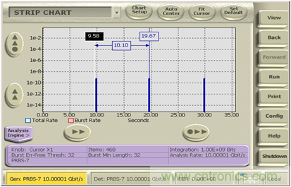 由于客戶的系統(tǒng)要進行長時間的(-20到+80度下)的高低溫老化測試,客戶要看誤碼的性能和溫度變化的相關(guān)性,一般的誤碼儀只能統(tǒng)計溫度變化過程中誤碼的總的個數(shù)和誤碼率,而無法得知在整個十幾個小時里面任一時刻誤碼率的變化。而BSX系列誤碼儀則可以使用Strip chart的記錄功能將整個過程中記錄下來,后面可以根據(jù)需要查詢?nèi)我鈺r刻的誤碼率變化情況。如下圖,在第10/20/30秒的時間點出現(xiàn)了一些突發(fā)的誤碼,這個如果僅僅是通過簡單的誤碼統(tǒng)計是無法看到時間相關(guān)的細節(jié)的,而且其累積記錄時間可以長達幾十小時甚至幾天。