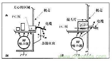 使共模電流注入到I/O區(qū)的另一機理,是附近有強的干擾源的耦合。甚至有些“屏蔽”連接器也無用,因為干擾源就在連接器附近,如PC機環(huán)境。如果在連接器和底板之間有一個缺口,此處所感應的RF電壓可以使EMC性能下降(圖1B)。