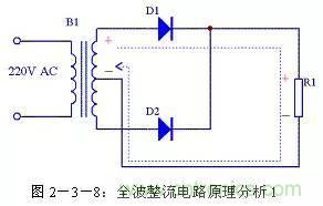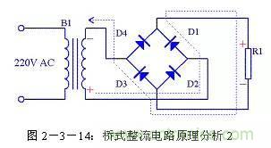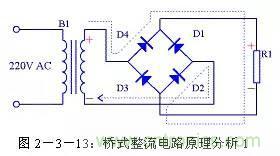 由圖2-3-13可以看出在電源正半周時(shí),B1次級(jí)上端為正,下端為負(fù),整流二極管D4和D2導(dǎo)通,電流由變壓器B1次級(jí)上端經(jīng)過D4、R1、D2回到變壓器B1次級(jí)下端;由圖2-3-14可以看出在電源負(fù)半周時(shí),B1次級(jí)下端為正,上端為負(fù),整流二極管D1和D3導(dǎo)通,電流由變壓器B1次級(jí)下端經(jīng)過 D1、R1、D3回到變壓器B1次級(jí)上端。R1兩端的電壓始終是上正下負(fù),其波形與全波整流時(shí)一致。