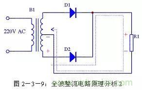 由于半波整流電路的效率較低,于是人們很自然的想到將電源的負(fù)半周也利用起來,這樣就有了全波整流電路。全波整流電路圖見圖2-3-6。相對(duì)半波整流電路,全波整流電路多用了一個(gè)整流二極管D2,變壓器B1的次級(jí)也增加了一個(gè)中心抽頭。這個(gè)電路實(shí)質(zhì)上是將兩個(gè)半波整流電路組合到一起。在0~π期間B1次級(jí)上端為正下端為負(fù),D1正向?qū)ǎ娫措妷杭拥絉1上,R1兩端的電壓上端為正下端為負(fù),其波形如圖2-3-7(b)所示,其電流流向如圖2-3-8所示;在π~2π期間B1次級(jí)上端為負(fù)下端為正,D2正向?qū)ǎ娫措妷杭拥絉1上,R1兩端的電壓還是上端為正下端為負(fù),其波形如圖2-3-7(c)所示,其電流流向如圖2-3-9所示。在2π~3π、3π~4π等后續(xù)周期中重復(fù)上述過程,這樣電源正負(fù)兩個(gè)半周的電壓經(jīng)過D1、D2整流后分別加到R1兩端,R1上得到的電壓總是上正下負(fù),其波形如圖2-3-7(d)所示。