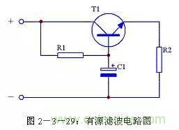 當(dāng)對(duì)濾波效果要求較高時(shí),可以通過增加濾波電容的容量來提高濾波效果。但是受電容體積限制,又不可能無限制增大濾波電容的容量,這時(shí)可以使用有源濾波電路。其電路形式見圖2-3-29,其中電阻R1是三極管T1的基極偏流電阻,電容C1是三極管T1的基極濾波電容,電阻R2是負(fù)載。這個(gè)電路實(shí)際上是通過三極管T1的放大作用,將C1的容量放大β倍,即相當(dāng)于接入一個(gè)(β+1)C1的電容進(jìn)行濾波。